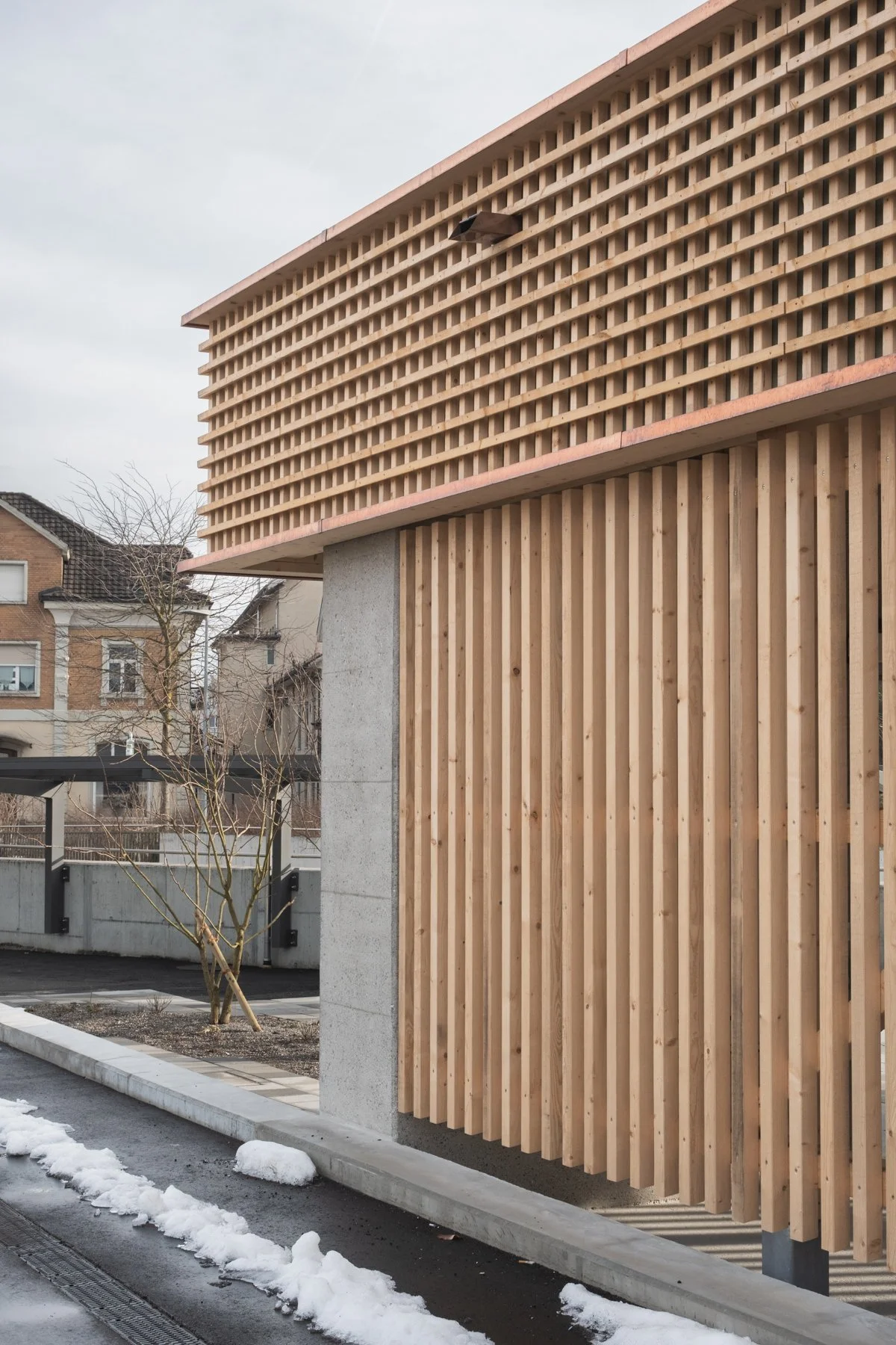 Das Baumdach setzt sich aus einer Mischung heimischer Baumarten zusammen, die das umliegende Landschaftsbild aufgreifen. Die Bäume regulieren als kühlende Elemente die Temperatur des Platzes, was sich auch positiv auf die angrenzenden Strassenbereiche auswirkt. Die Kühlfunktion wird durch die Integration lokaler Wasserrückhaltung in den nicht versiegelten Plätzen unterstützt.
